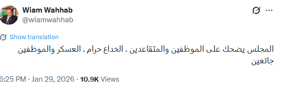 انتقد الوزير السابق وئام وهاب سياسة الـتأجيل والمماطلة تجاه حقوق الـعـسـكـريين والمـوظـفـيـن المتقاعدين، معتبراً في تغريدة له أن “ما يجري في المـجلـس (النيابي) هو ضحك على الأوجـاع.